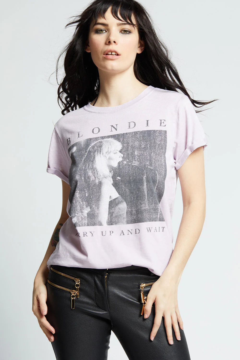 This wardrobe-essential Blondie tee features a faded black and white photo of Debbie Harry, and lyrics from the song "Sunday Girl". Made with soft vintage washed fabric, distressed hems, rolled short sleeves, a ribbed crew neckline, and our classic fitted style.