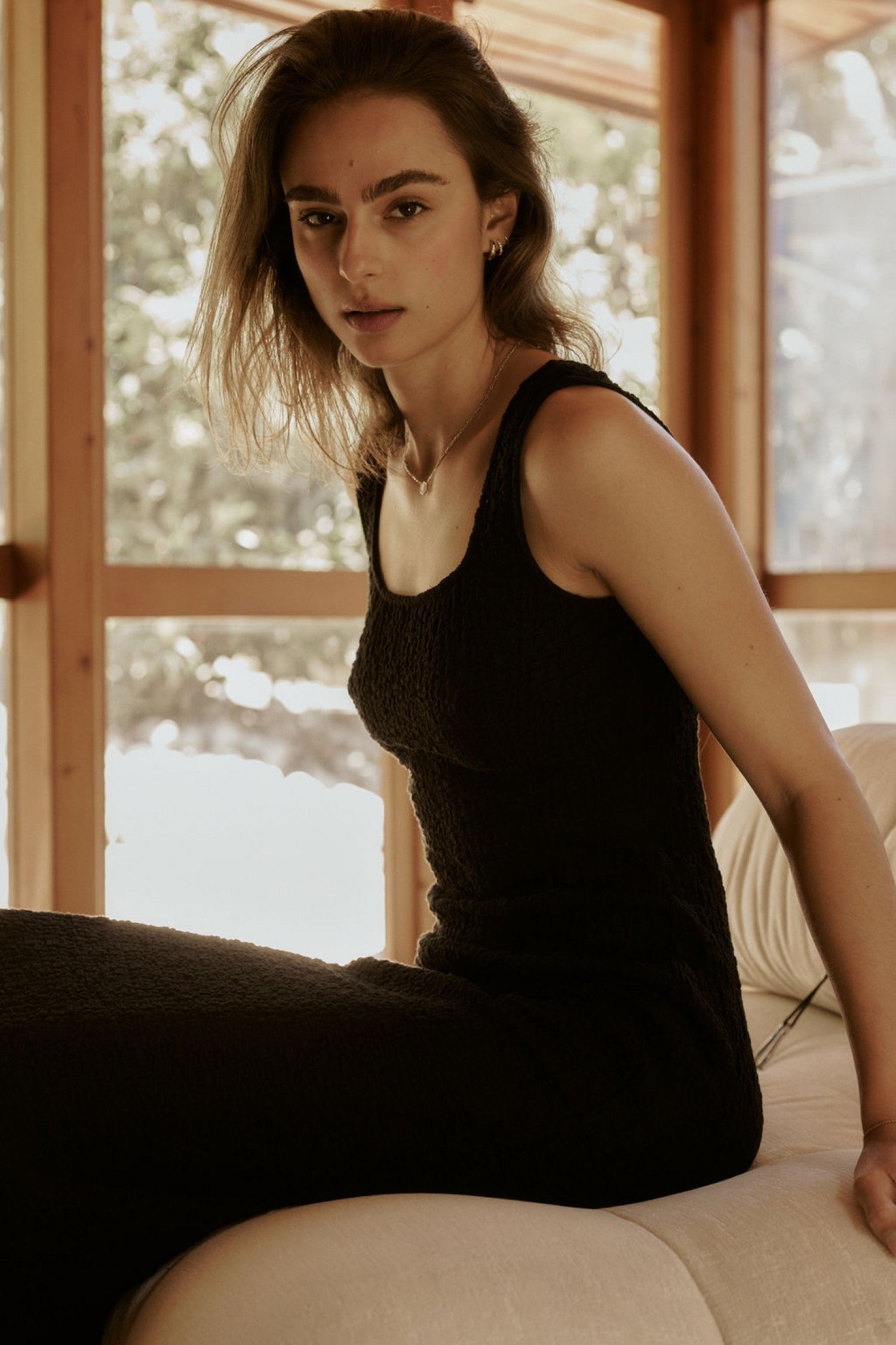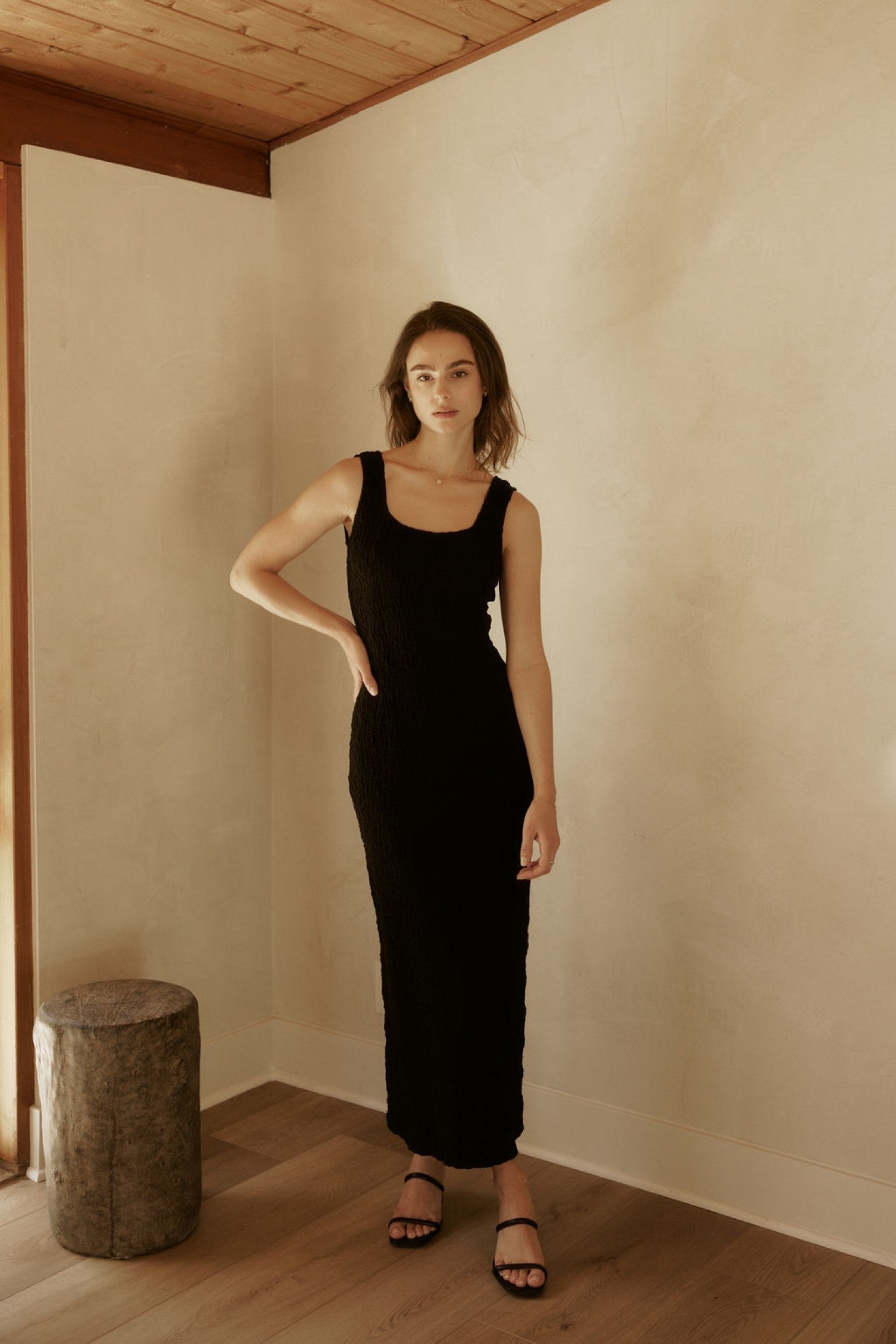 The Claudia Dress is a staple piece to add to your wardrobe. This lovely dress is cut from a soft, popcorn-textured crushed fabric and features a scooped round neck and side slit. Dress it up with a pair of heels or wear it casually with a pair of boots.