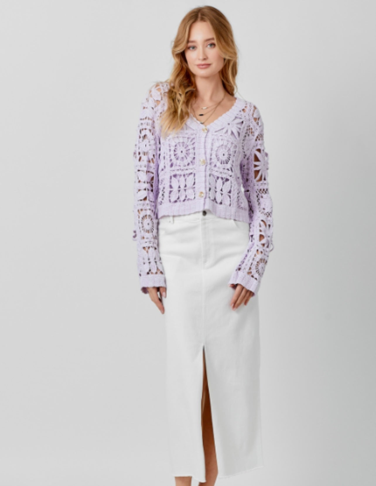 Bring on the 70's... This 100% cotton crochet button up cardigan is perfect for spring and summer.