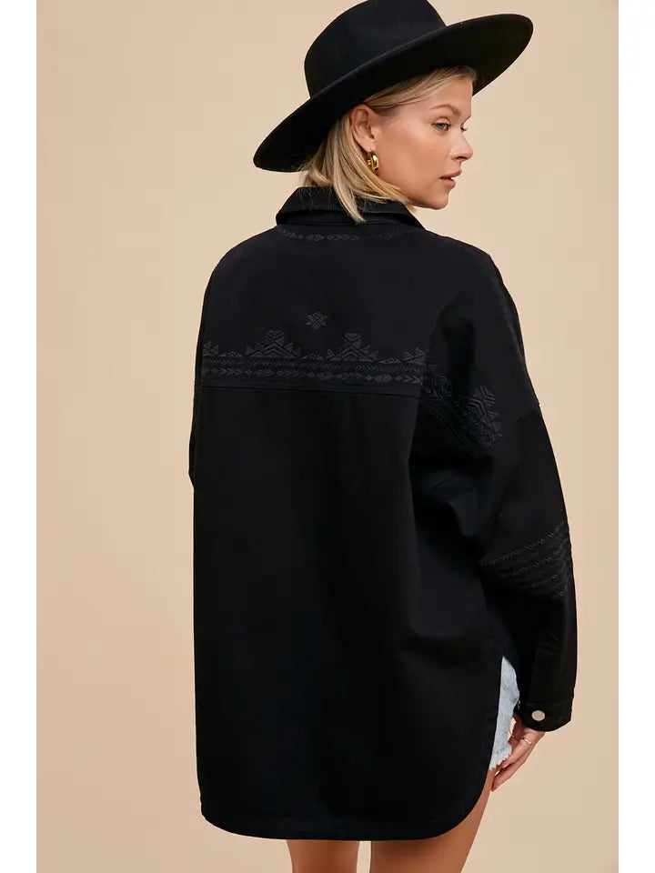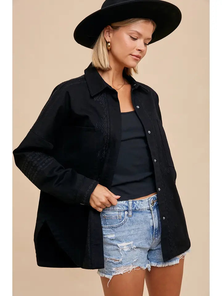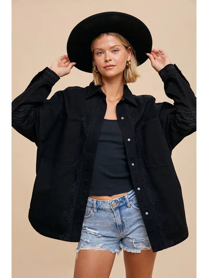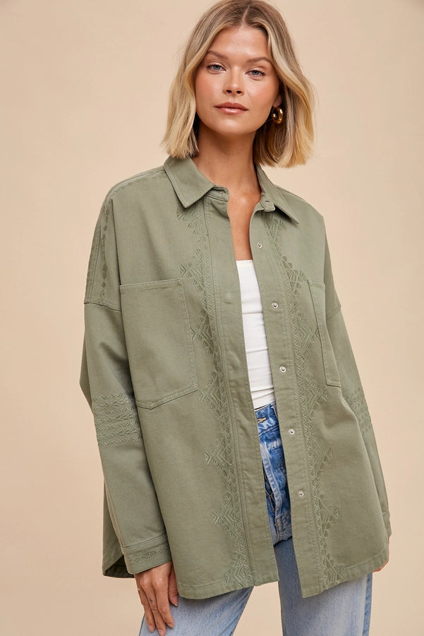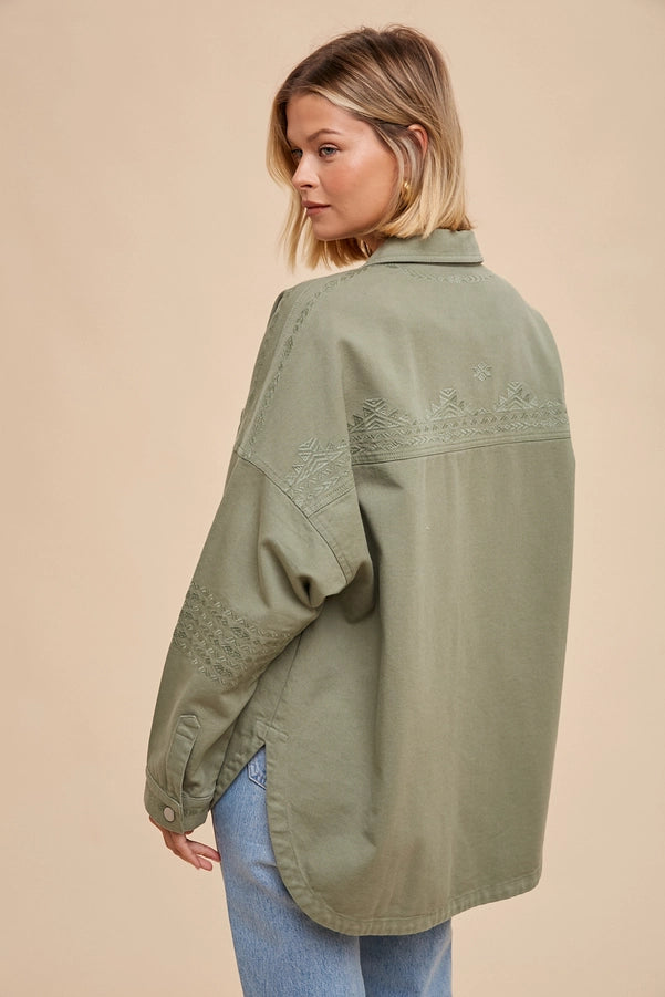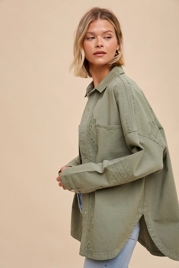 UTLITY SHACKET FEATURES, SUBTLE TONE ON TONE EMBROIDERY ON SLEEVES, PLACKET AND BACK, DOUBLE BREASTED POCKETS, AND METAL SNAP BUTTON CLOSURE.