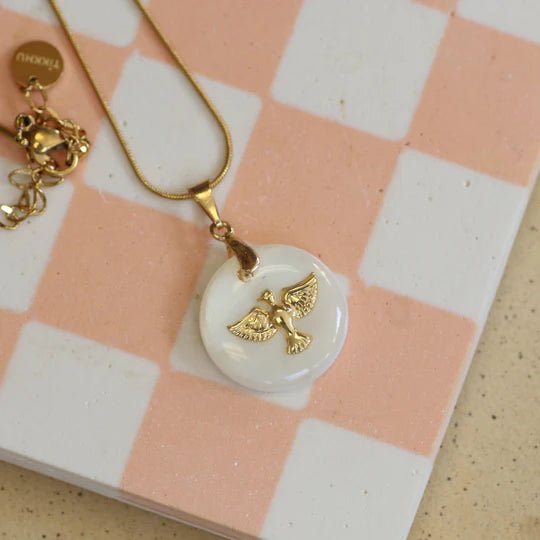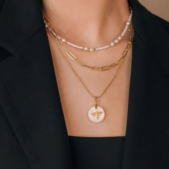 Materials: Gold plated stainless steel chain, mother of pearl + gold filled brass pendant