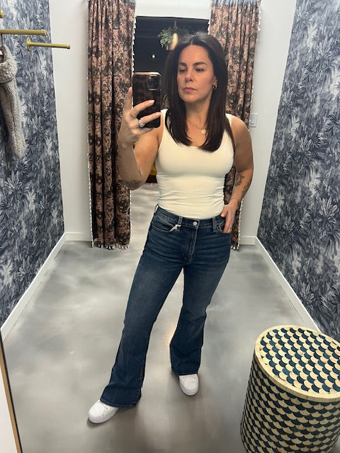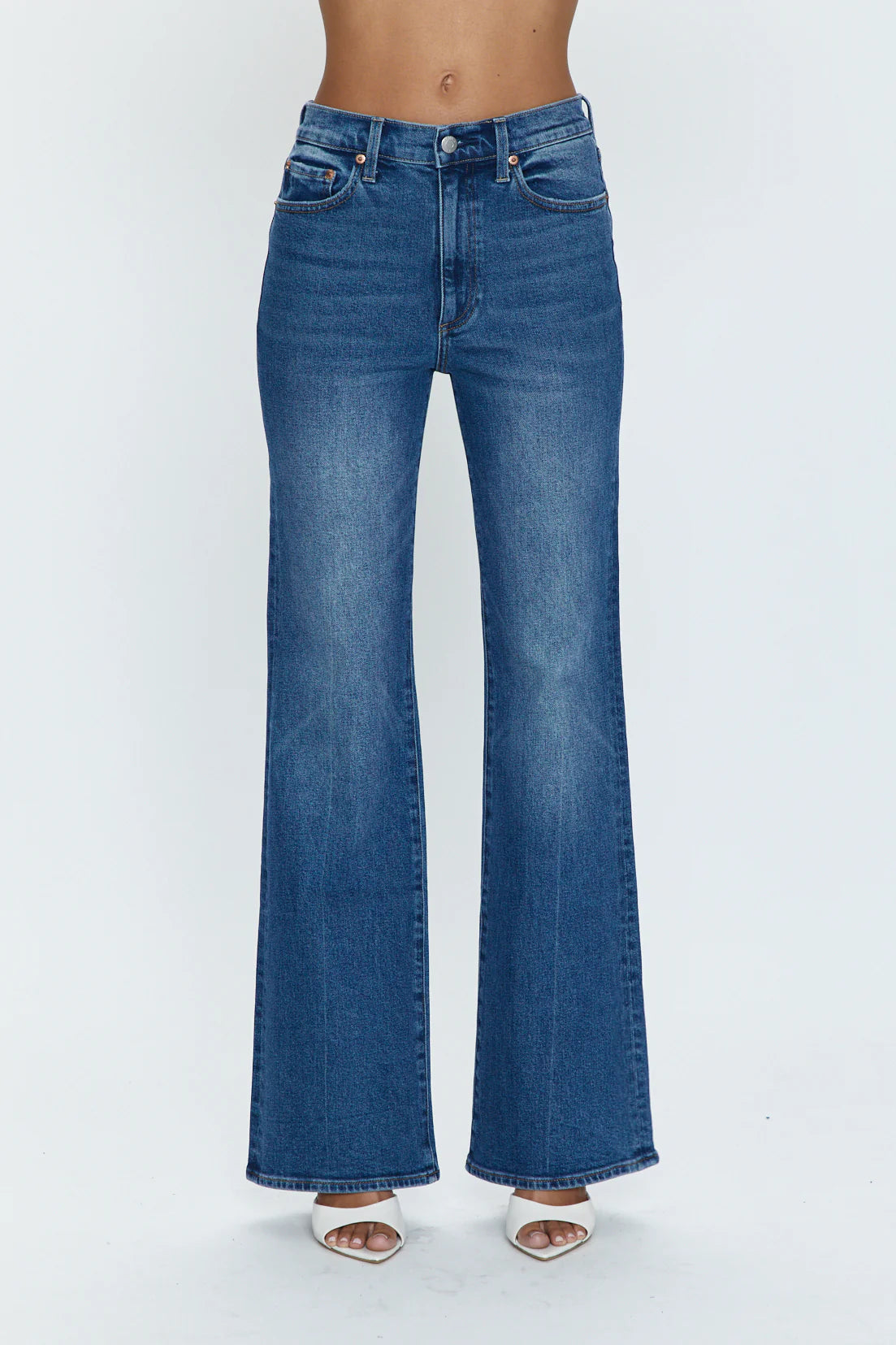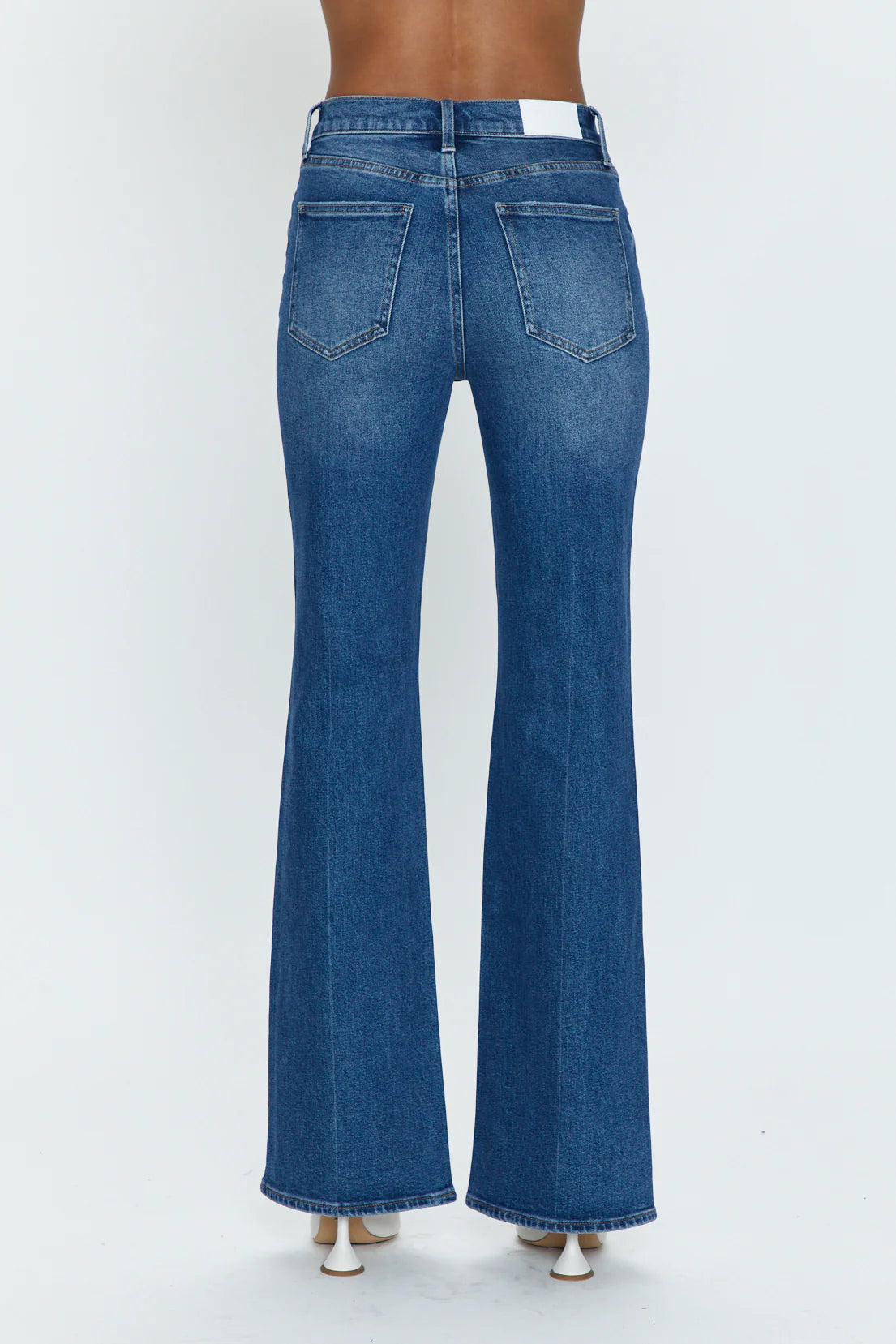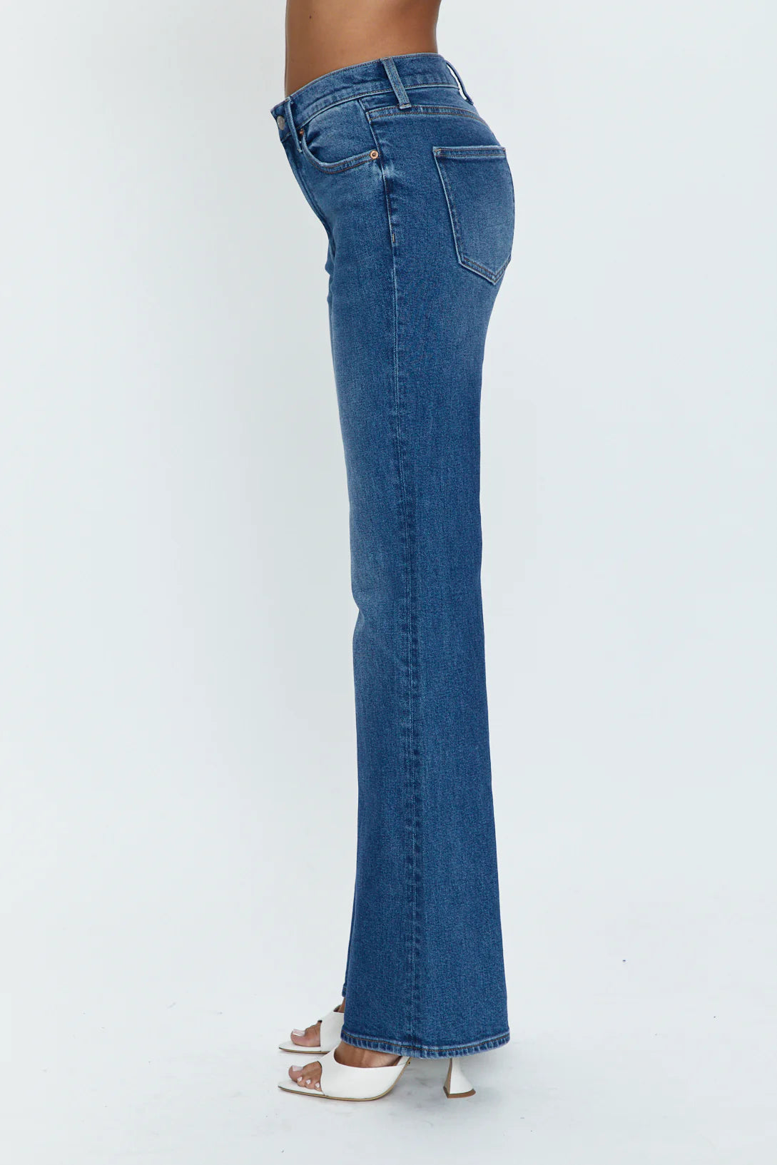 A slimming silhouette, complimented by its figure hugging, comfort stretch denim construction. High rise waist, with a tapered knee that falls to a flared bootcut leg that emphasizes elongated proportions. Offered in a medium blue wash with fading and whiskering, and a clean full length hem.