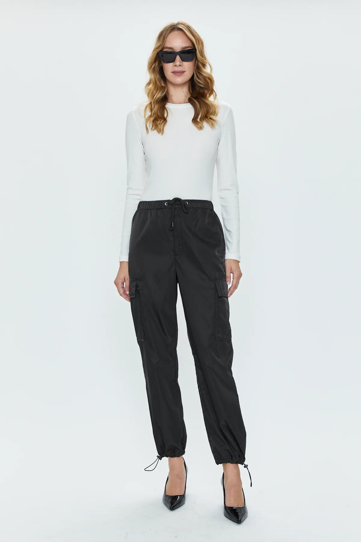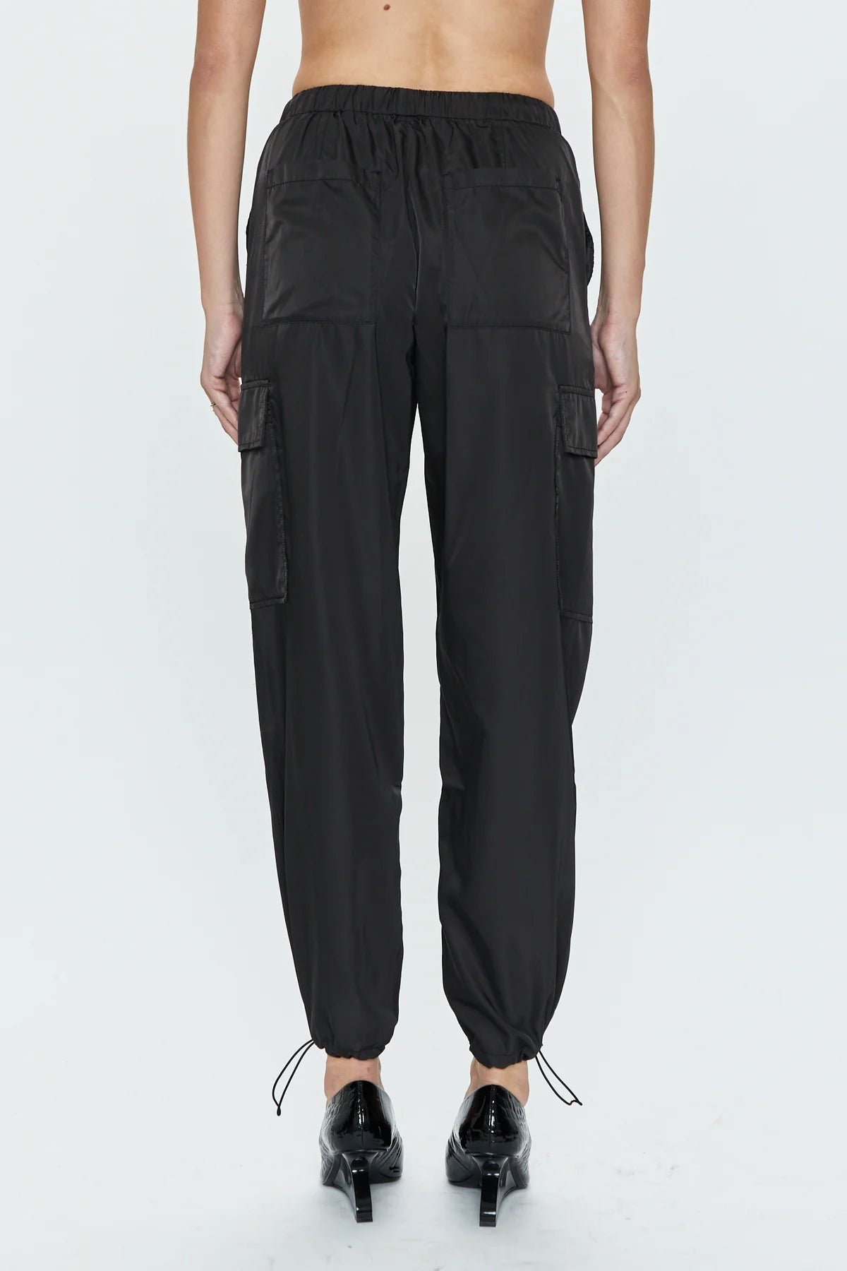 Cargo trouser silhouette crafted from a lightweight nylon fabric that keeps it's cool, with a slight sheen that dresses up its utilitarian pockets and detailing. Adjustable ankle toggles adapt the fit between a jogger or straight leg shape as desired.
