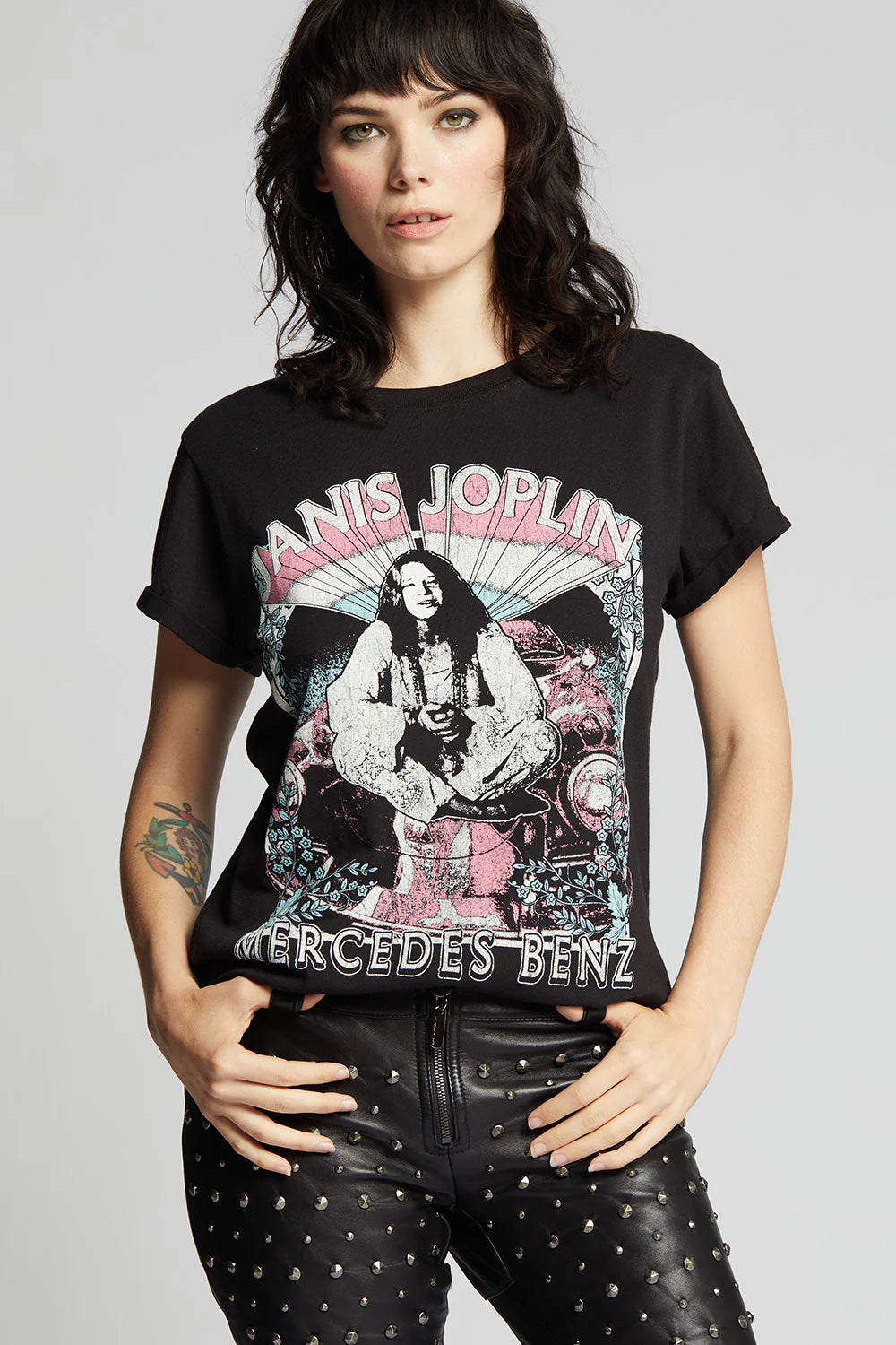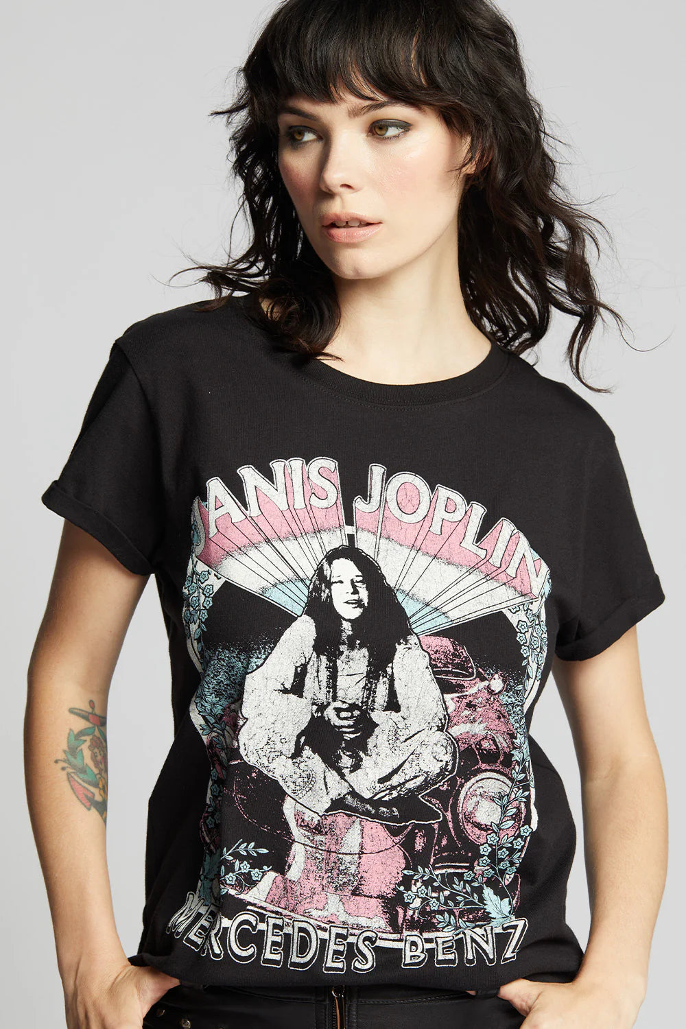 Glam up your wardrobe with fashion and flair in our Janis Joplin Mercedes Benz Tee! Released in 1971, this beloved hit single was issued on the B-side of Joplin's chart-topper "Cry Baby." This style features a classic photo graphic of Janis Joplin, and "Mercedes Benz". Our fitted tee is made with soft cotton fabric, rolled short sleeves, a ribbed crew neckline, and vintage distressed hems.