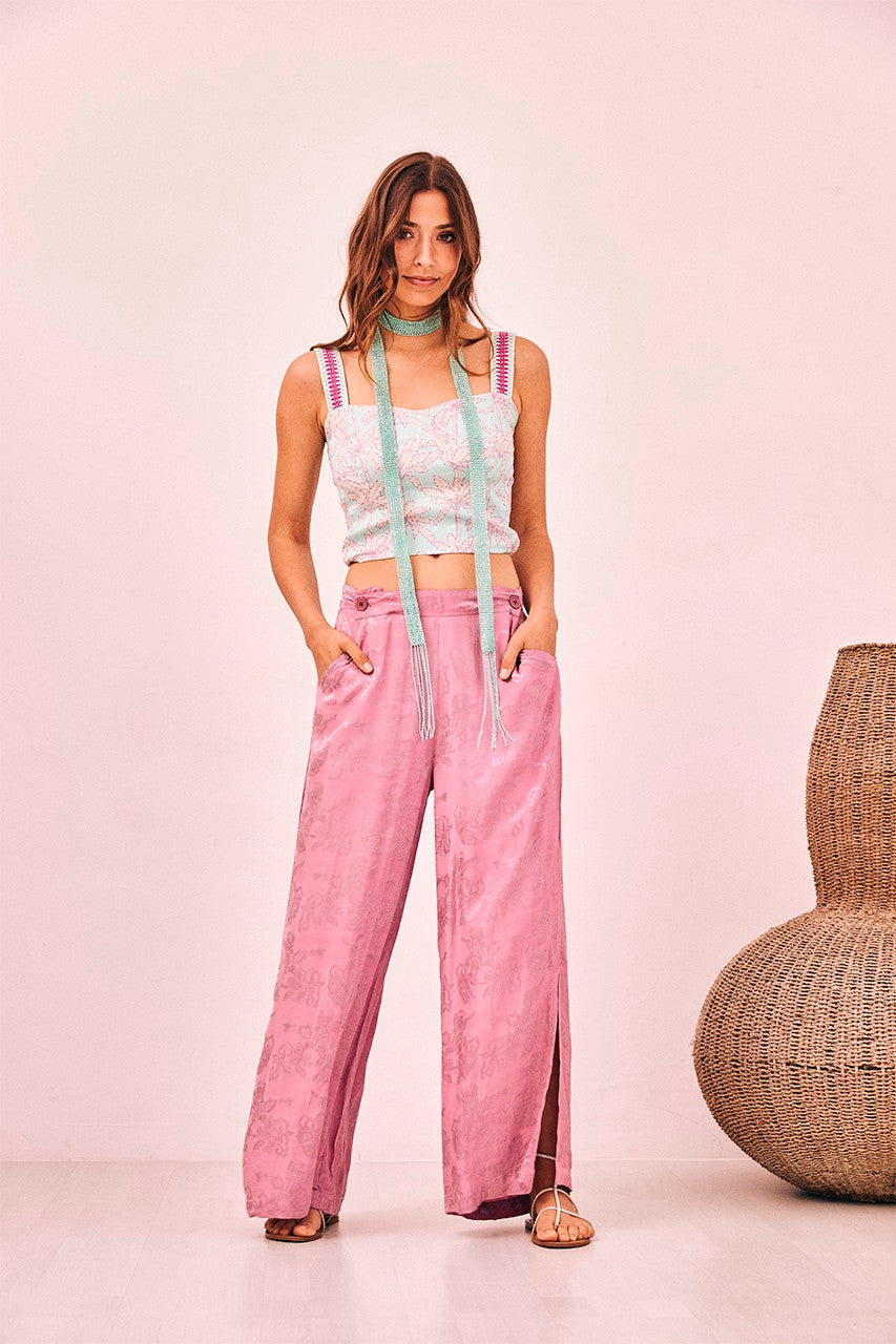 Short strap top to the waist with a blue print. Heart-shaped neckline and embroidered tape detail on the straps.