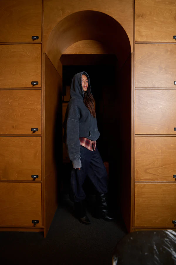 Heavyweight washed vintage black hoodie with a relaxed boyfriend fit and snap details.