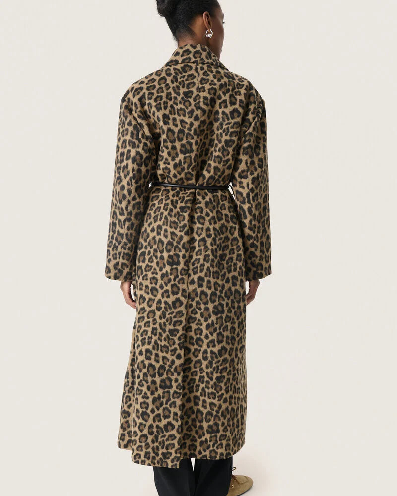Designed with a double-breasted closure and a slim belt at the waist, it creates a flattering, structured silhouette. Falling gracefully below the knee, the coat’s clean lines and statement print make it a standout piece for layered styling, whether worn casually or dressed up.