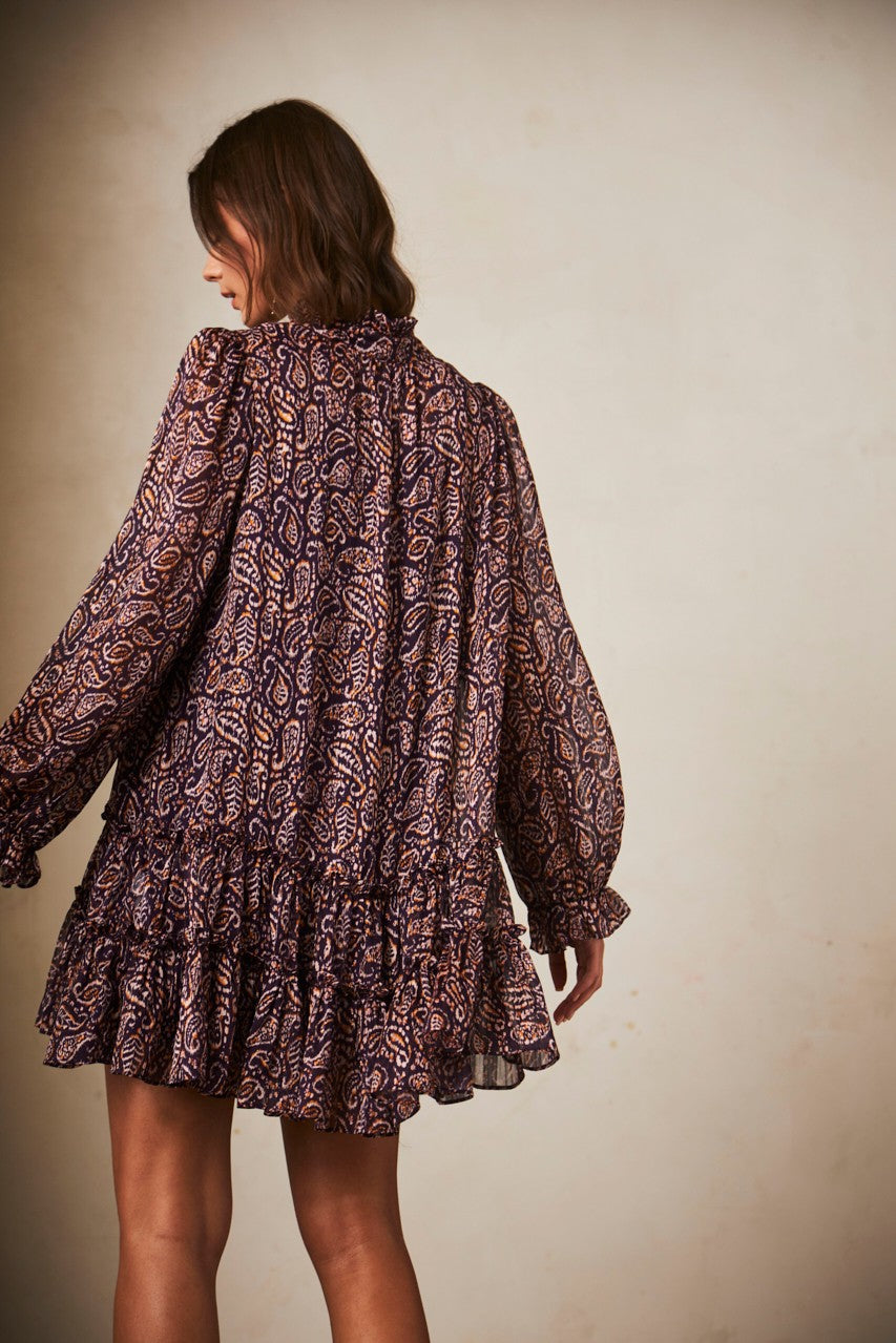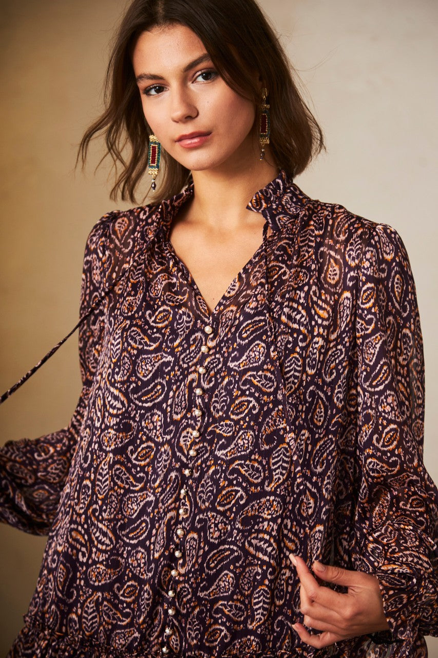 Short dress with long sleeves. Oversize with print. V-neck with front buttons.