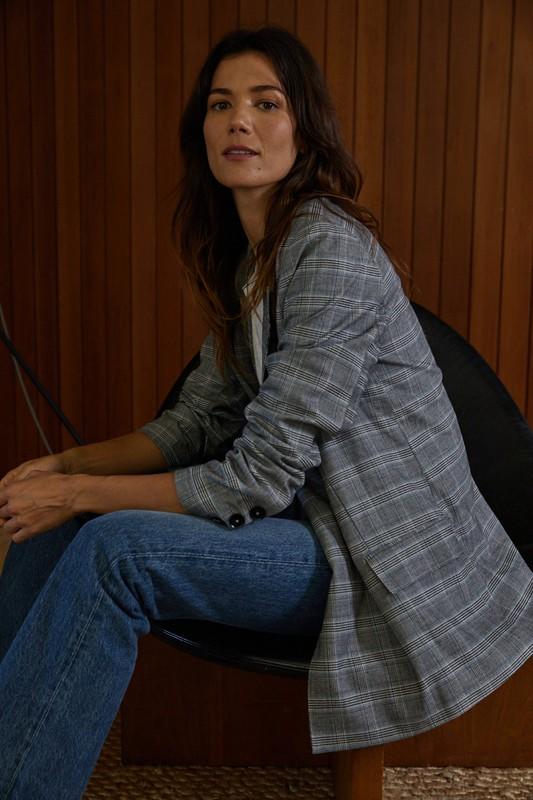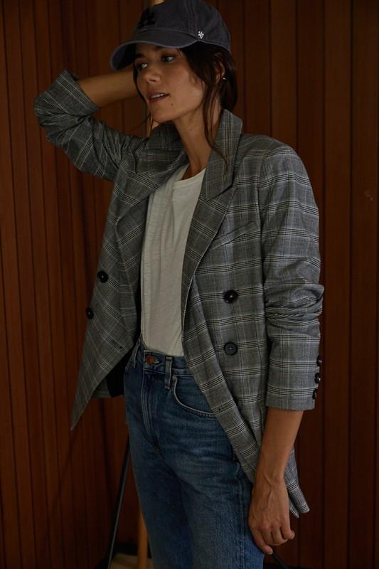 Woven Long Sleeve Oversized Plaid Blazer w/ Shoulder Pads