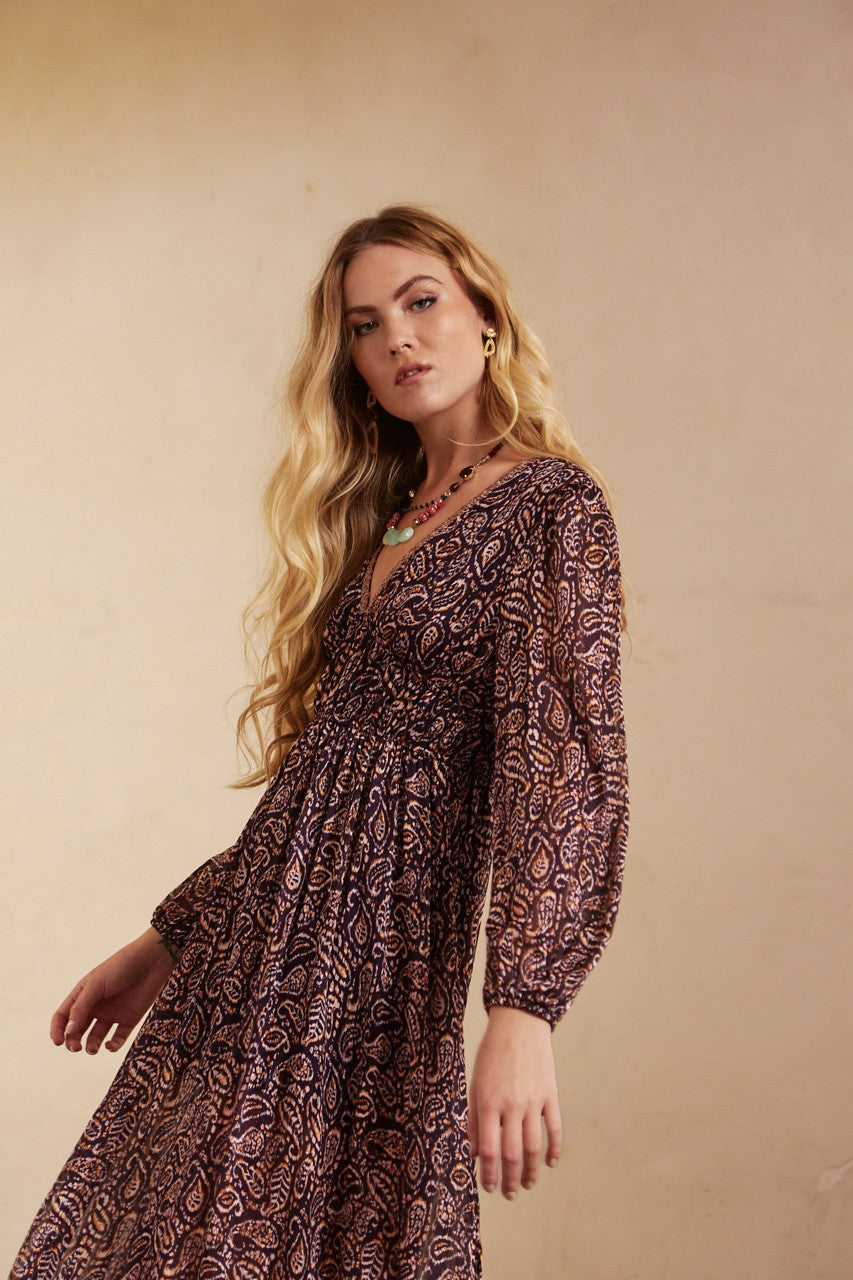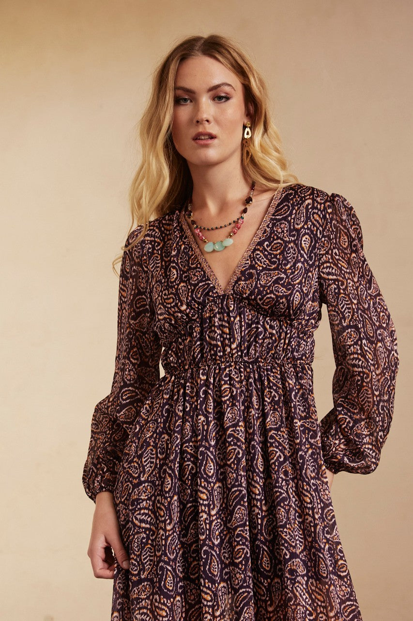 Long sleeve dress. Paisley print. V-neck with embroidered and gathered details. Side openings.