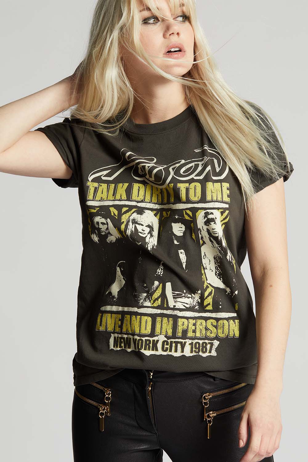 Bring the glam with this Poison NYC 1987 Concert Tee, perfect for a fun night out! Featuring authentic graphics from their legendary New York City live performance, this tee showcases the band members, their hit song "Talk Dirty To Me," and "Live And In Person New York City 1987" verbiage. Our fitted tee is made with soft cotton fabric, rolled short sleeves, a ribbed crew neckline, and vintage distressed hems.