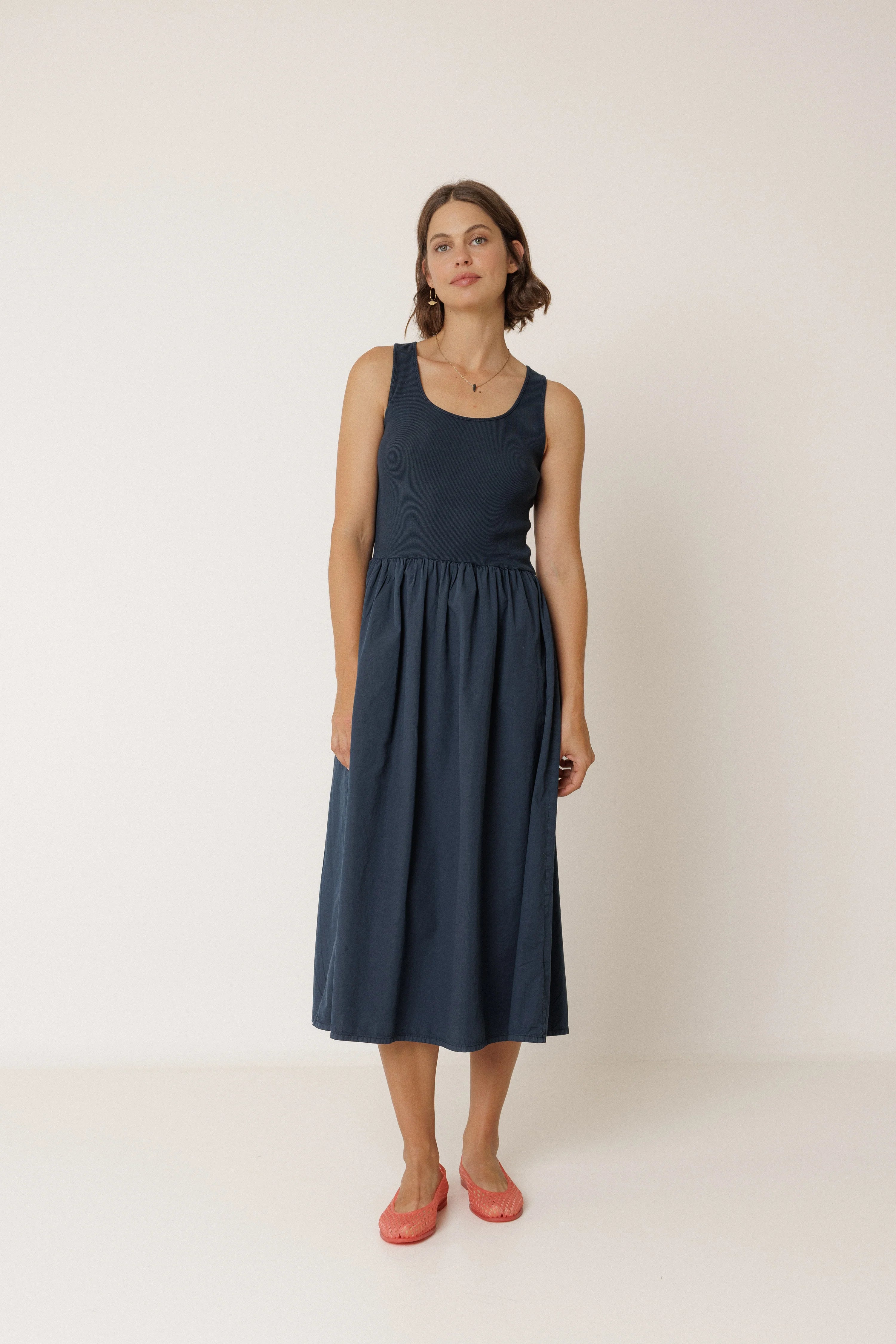 The Poplin Dress from Indi & Cold is an easy, everyday style crafted from 100% woven cotton. Designed with a fitted ribbed bodice and a softly gathered skirt, it features a round neckline and a sleeveless cut for a comfortable, flattering silhouette.