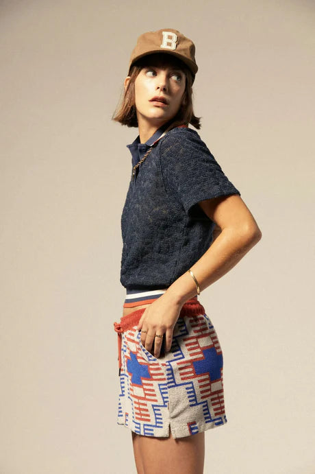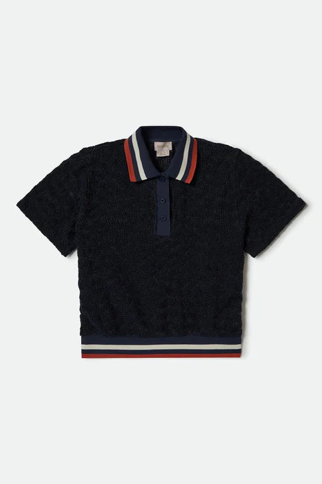 The Retro Mesh Short Sleeve Polo blends sporty sophistication with everyday ease. Crafted from a lightweight cotton blend spandex mesh, it offers breathable comfort and flexibility. Its navy blue design is elevated with red and white stripe detailing on the ribbed collar and hem. Polished yet casual, this women's polo transitions effortlessly from a laid-back outing to a sporty ensemble.