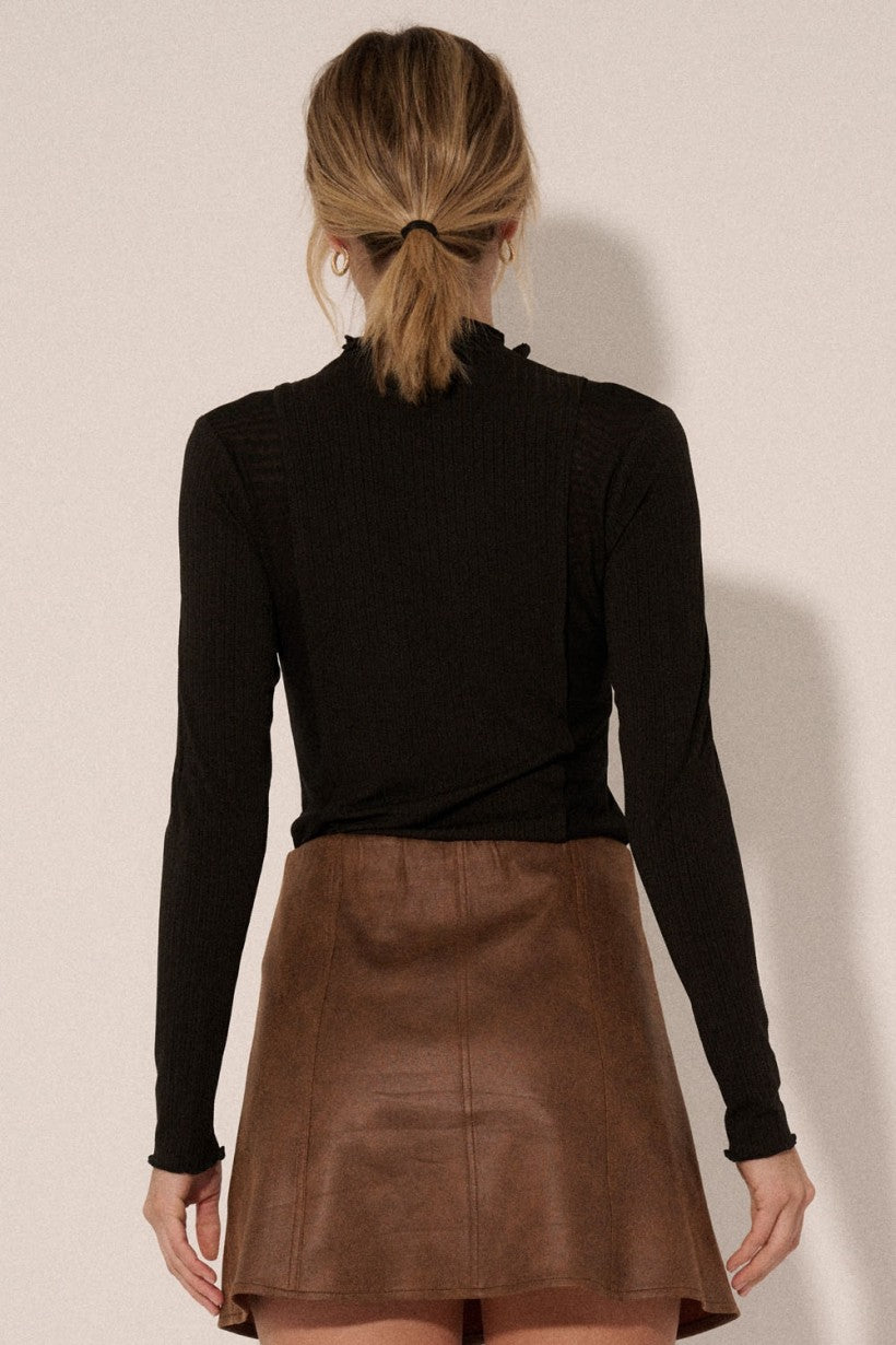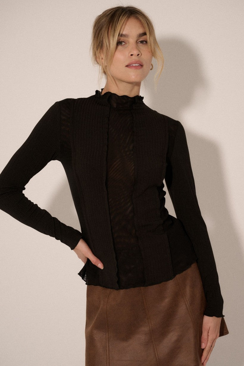High neckline with ruffle.