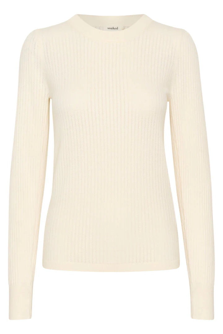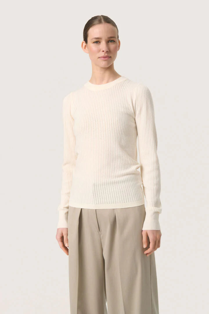 A lighter-weight sweater to take us from Summer into Autumn, the Spina has a crew neck and slightly puffed sleeves with a long cuff. It comes in a rich cream "whisper white" and pale sage "shadow". This is a useful transitional piece and would look equally great with a trouser suit or with jeans.