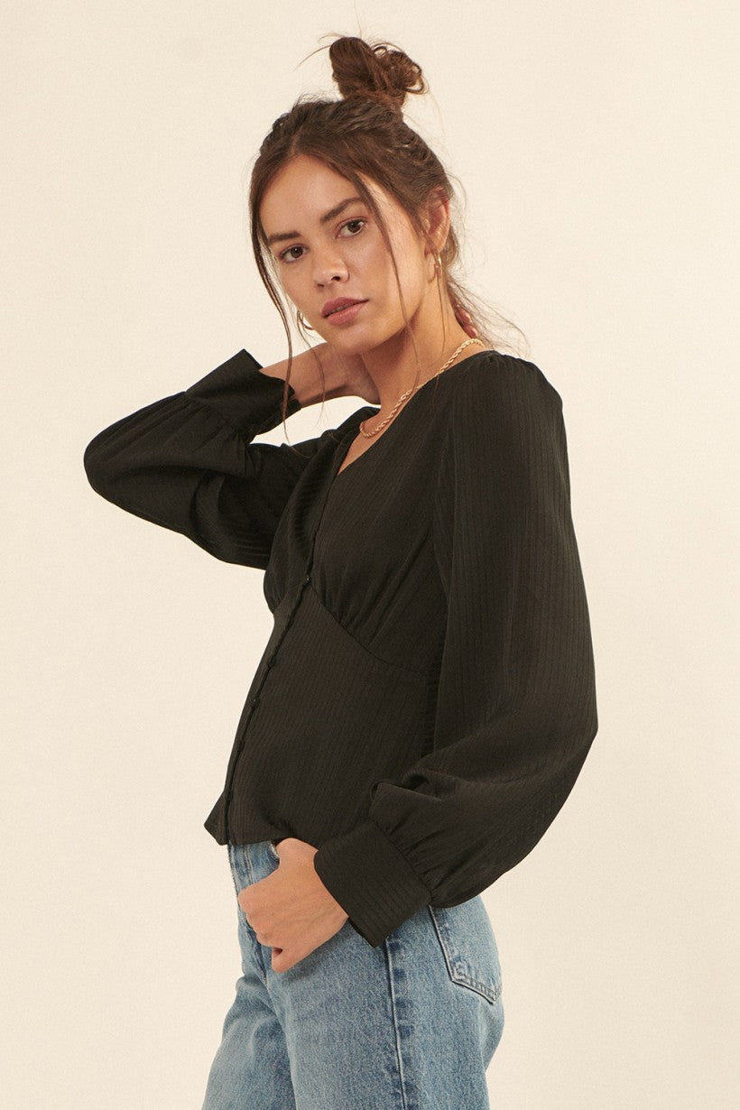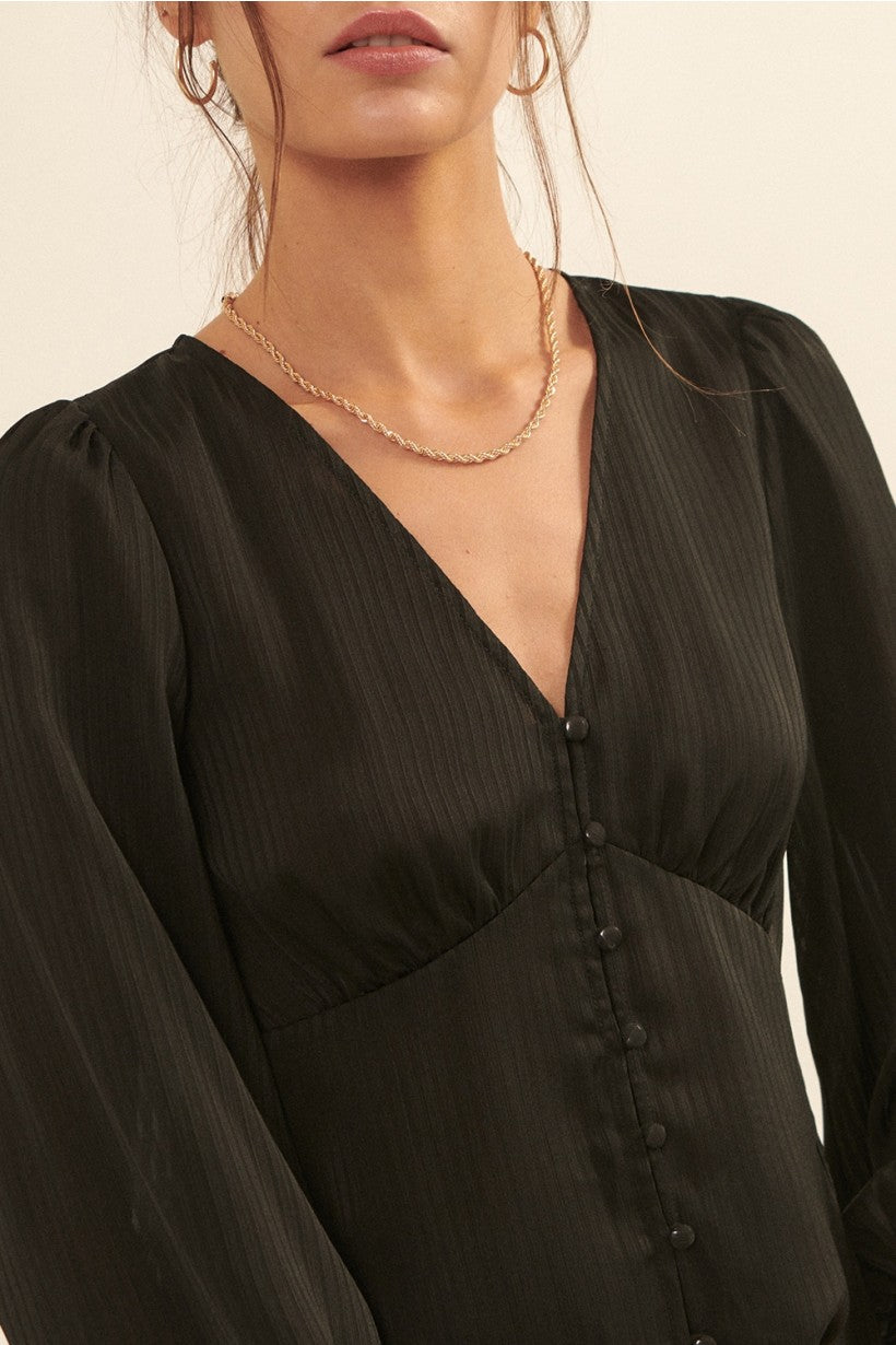 A striped, satin woven blouse with the following features: