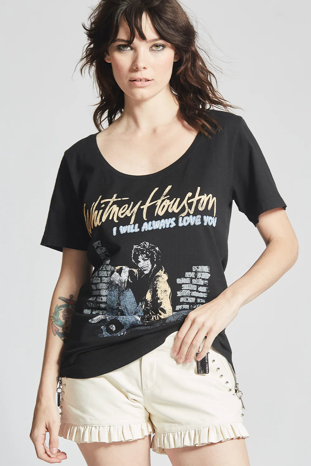 Join us in celebrating the singing legend we all know and love with this Whitney Houston, I Will Always Love You scoop neck tee. Released in 1974, “I Will Always Love You” was originally written and performed by Dolly Parton, and later covered by Houston for the 1992 film, “The Bodyguard”. This vintage inspired tee is designed with the artist’s name, song title, and a photo of Houston herself. Made with a flattering scoop neck, short sleeves, a slightly oversized fit, and a rounded hem.