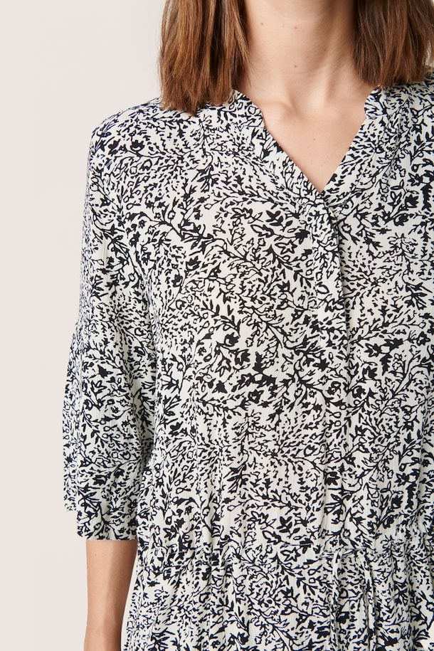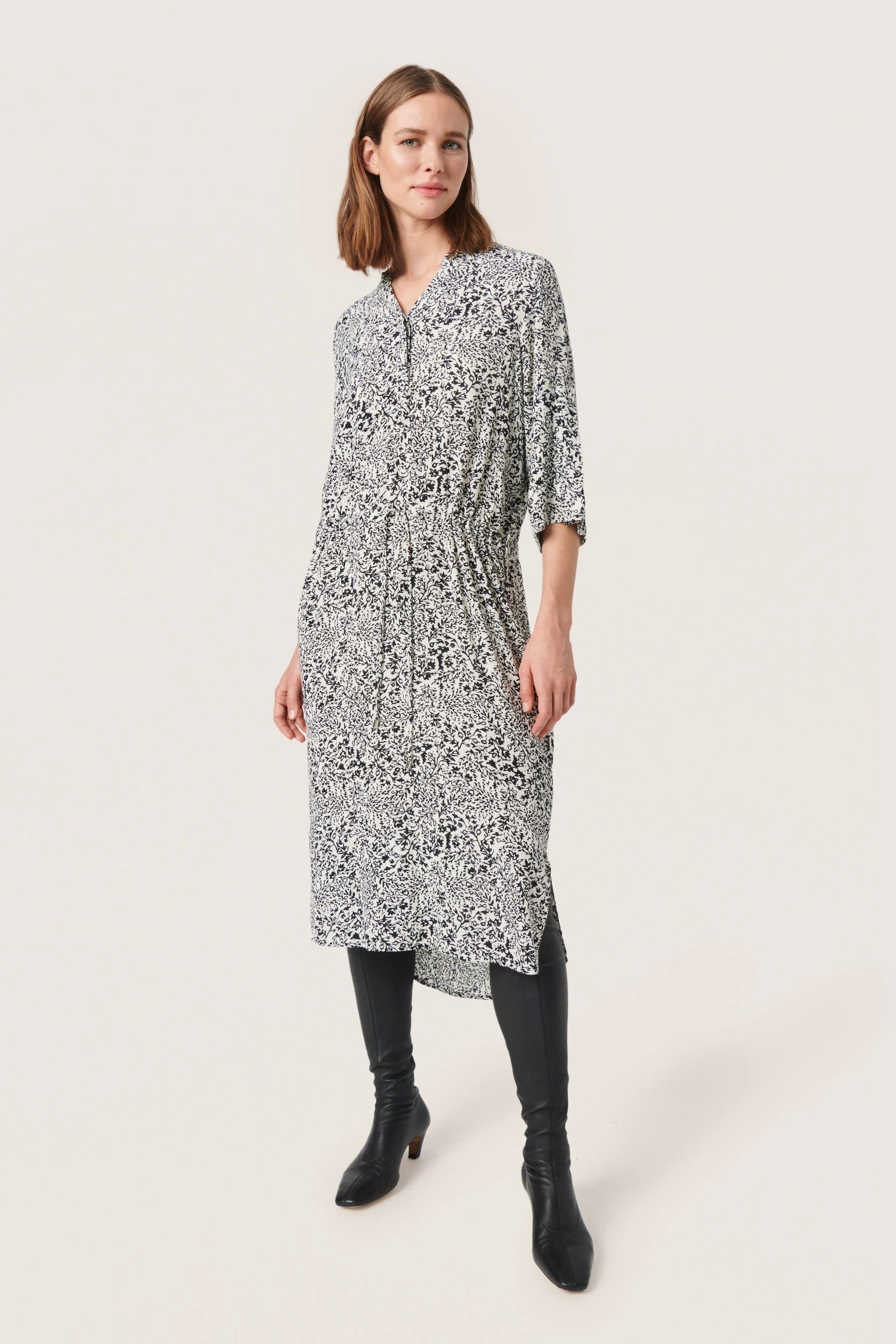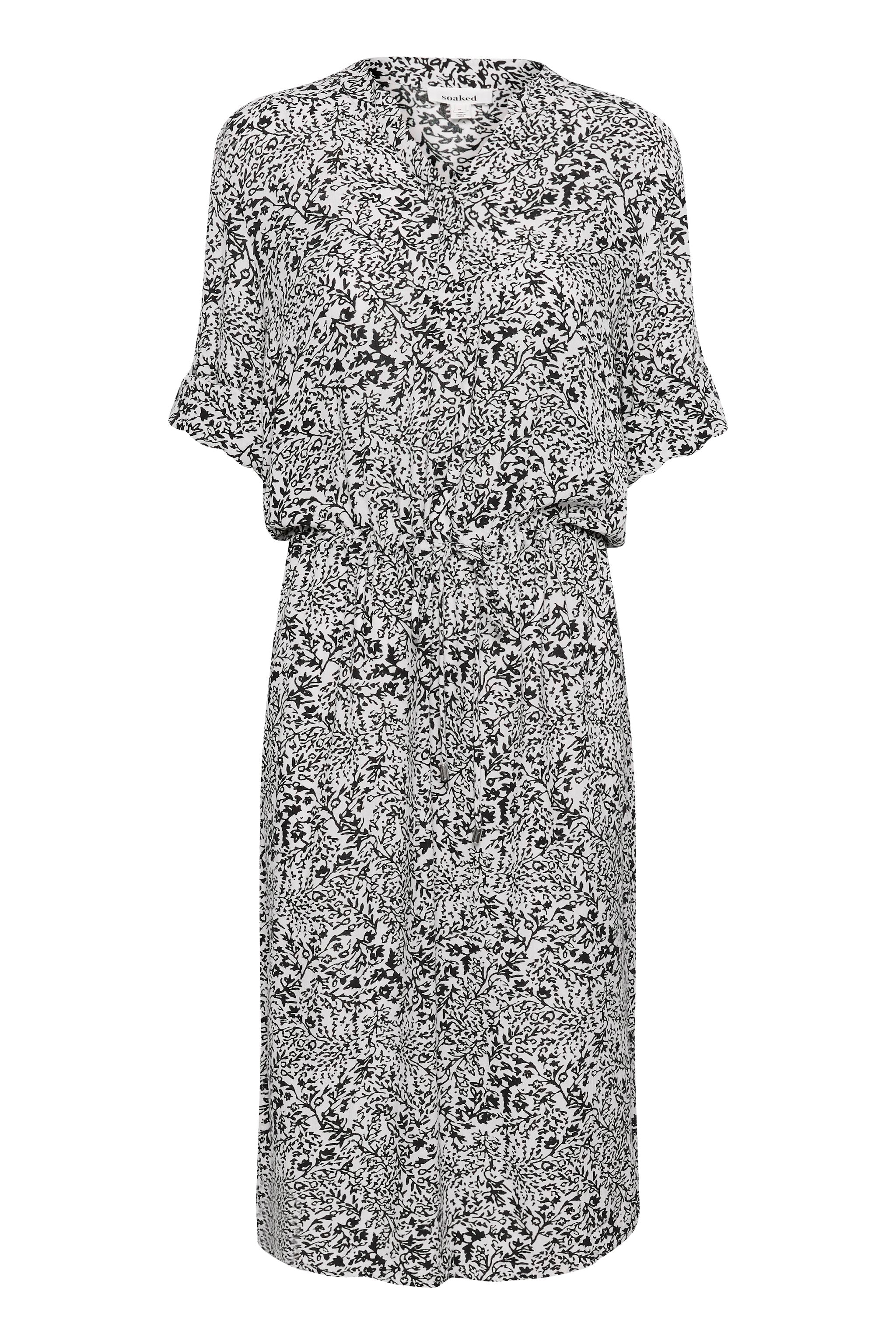 Dress in regular fit, with button closure at the neck, tie at the waist and 3/4 sleeves and slits at the sides.